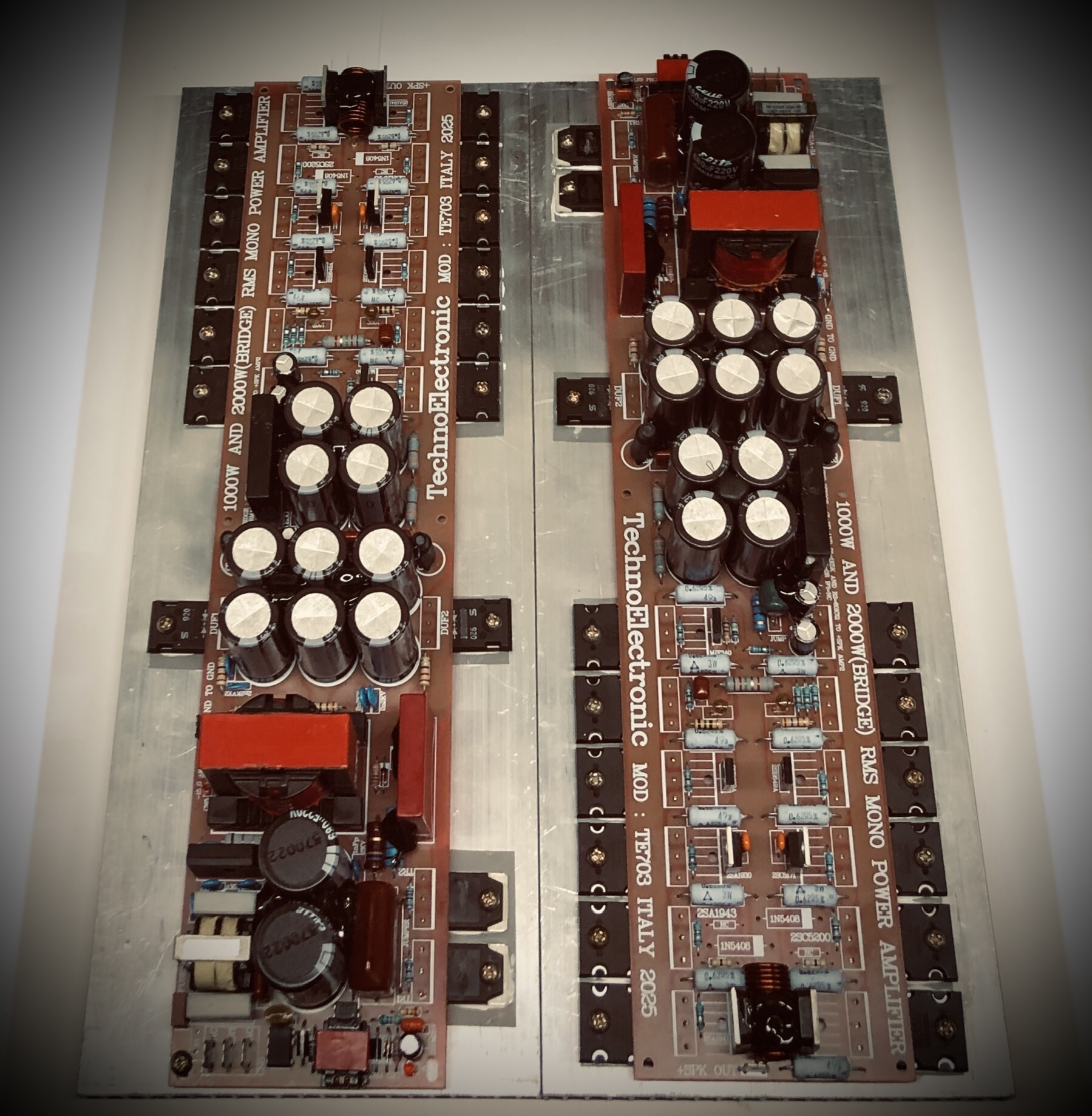 مدار کامل آمپلی فایر استریو ۱۰۰۰ وات rms استریو ( 500W + 500W ) با منبع تغذیه سویچینگ و برق مستقیم شهر ۲۲۰ ولت بدون نیاز به نراتس و رکتی فایر به صورت پک کامل دارای محافظ برق ، هیتسینگ مدار کامل و مونتاژ شده